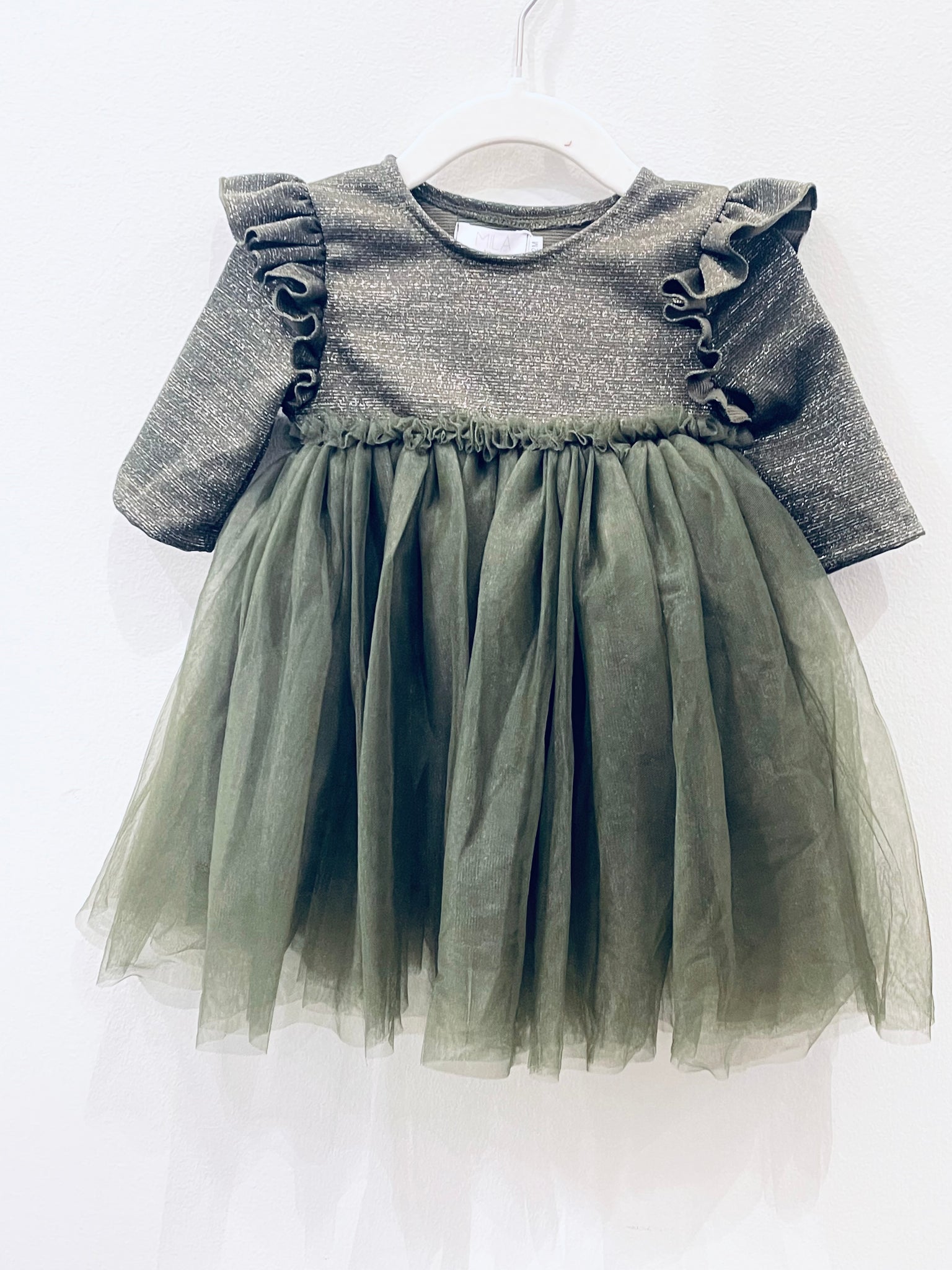This elegant olive green dress features a shimmering top that catches the light beautifully. Delicate ruffles accent the shoulders and waist, adding a refined touch to its silhouette. Crafted with a double layer of soft toile overlay, it offers both comfort and a graceful flow, perfect for special occasions with timeless charm.