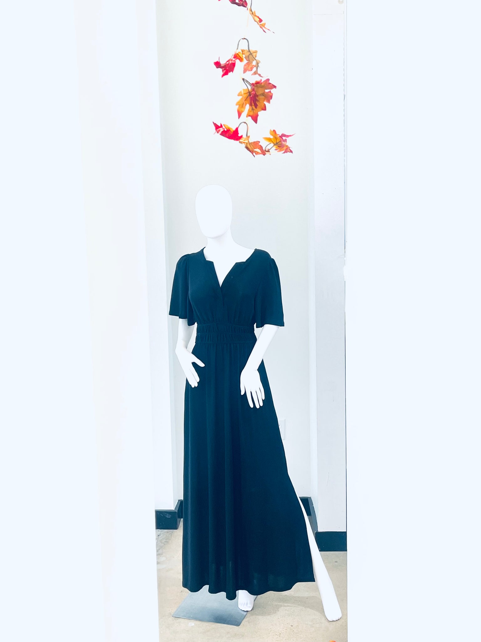 Elevate your evening look with the "Evening Ember" dress, crafted from a shimmering metallic Lurex knit. Featuring elegant bell sleeves, a flattering elastic waistband, and convenient pockets, this black dress combines comfort with refined style for a graceful silhouette perfect for any sophisticated occasion.