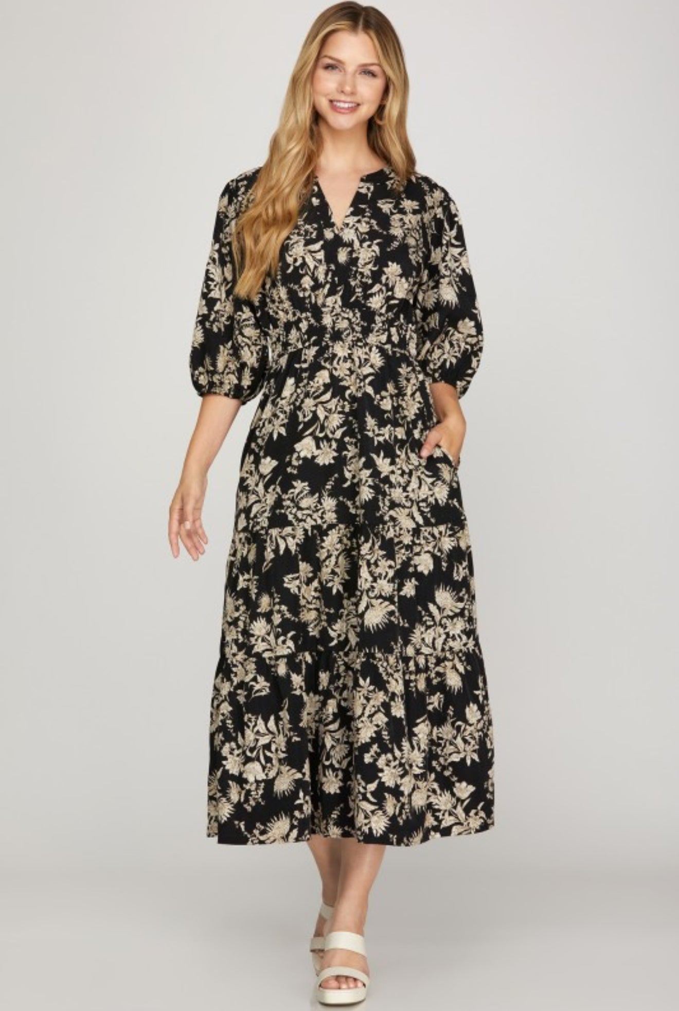 The "Floral Reverie" dress in blue features elegant 3/4 sleeves with elastic cuffs and a flattering V-neckline. Its smocked wide elastic waistband enhances the silhouette, combining comfort with refined style. Perfect for occasions where effortless sophistication is desired.