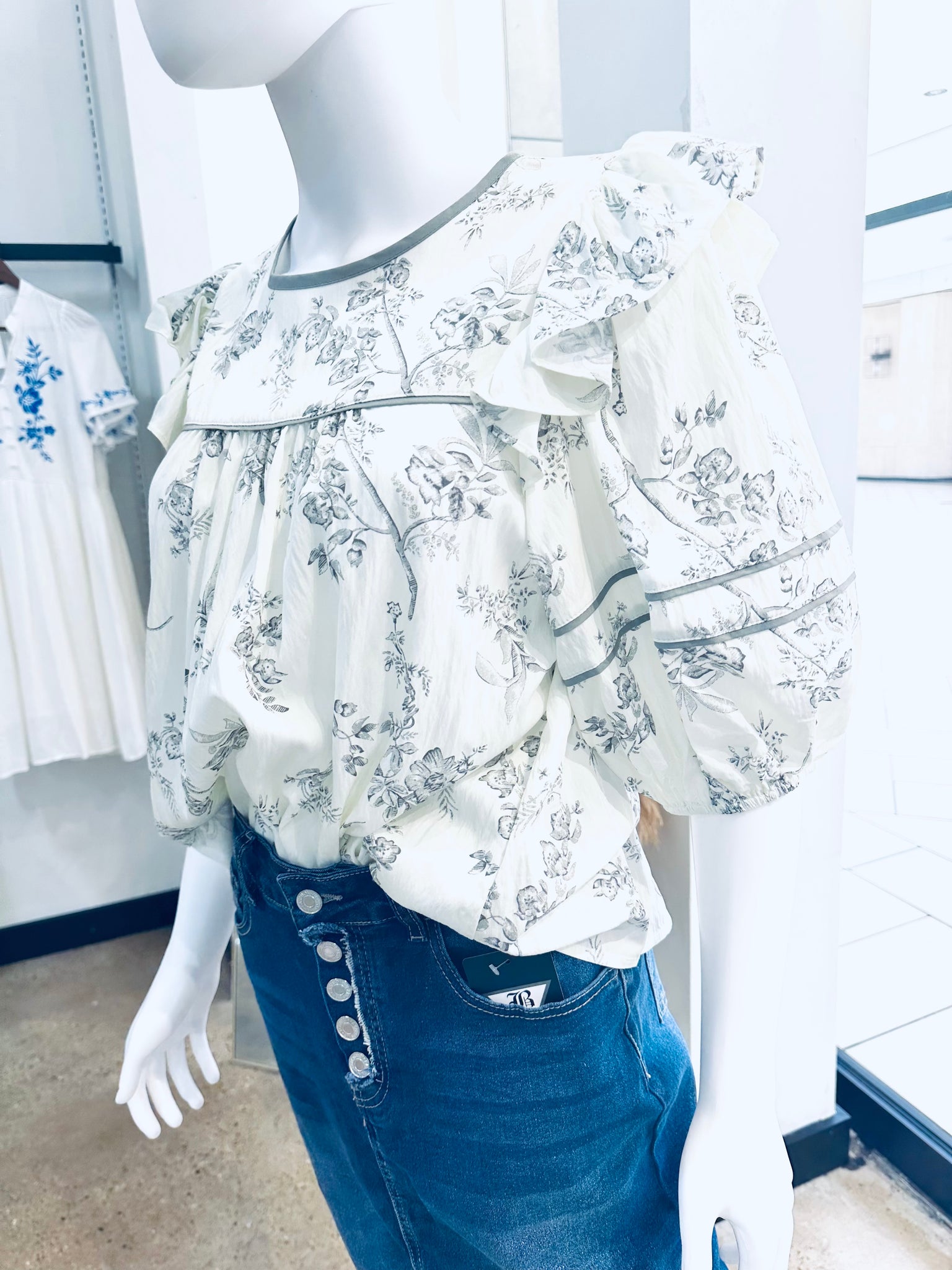 PpThe "Vintage Paths" top features a darling floral print, puff sleeves, and contrast piping that add a touch of retro charm. The babydoll style creates a flattering silhouette, while the 3/4 sleeves offer a versatile and stylish look. Perfect for adding a whimsical touch to any outfit.