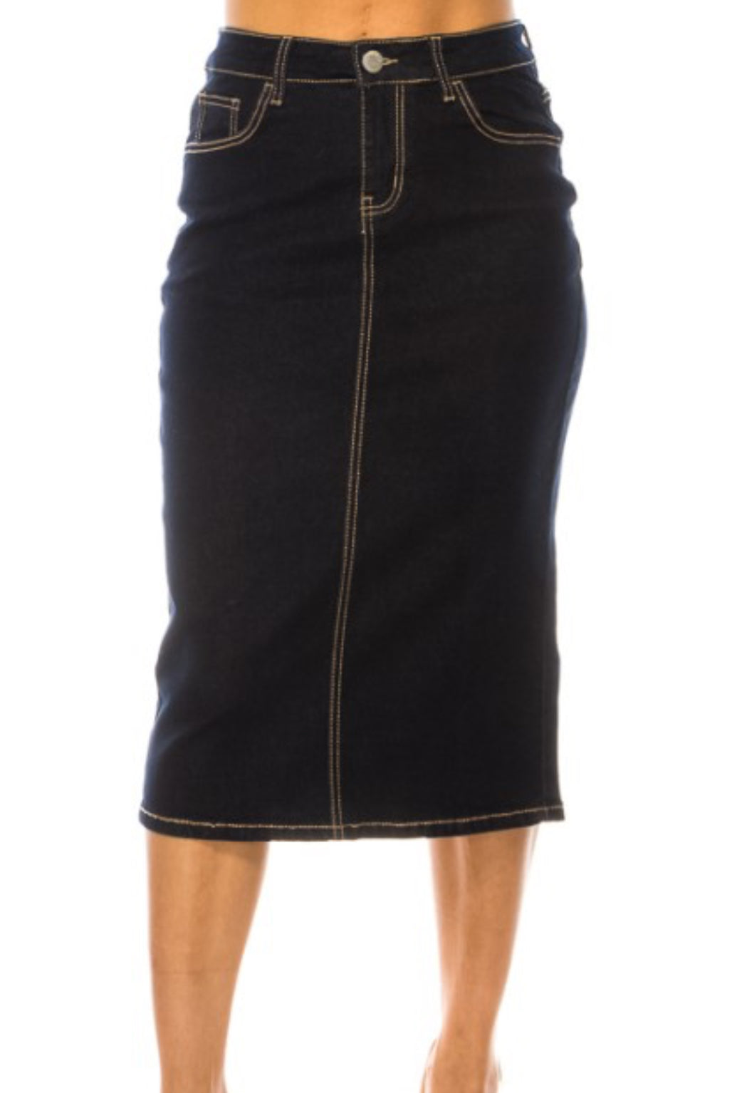 The "Stitched Dark Indigo" Be-girl skirt combines style and practicality with its dark wash fabric accented by dark tan stitching. Designed with convenient front and back pockets, it keeps essentials close at hand while adding to the skirt's trendy look. A secure zipper and button closure ensure a comfortable and confident fit, making this skirt a versatile must-have for any wardrobe.