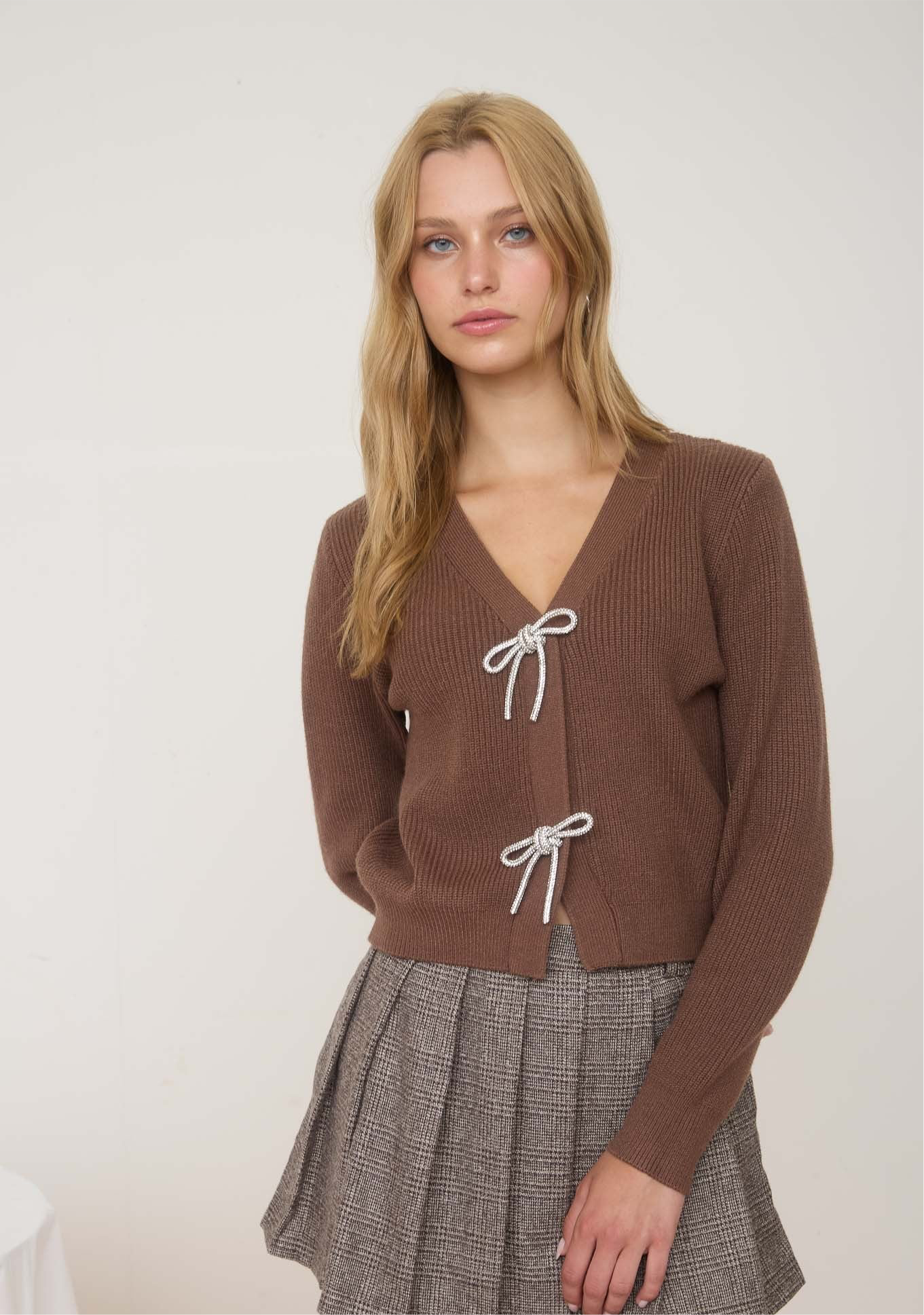 The "Bold Vision" cardigan features a refined ribbed texture complemented by silver sparkly bows that function as snap buttons on the front. This sophisticated design effortlessly blends tactile comfort with elegant sparkle, making it an exquisite addition to any wardrobe.