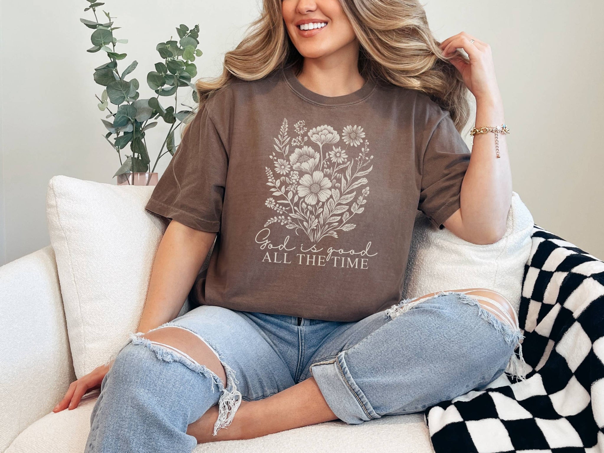 Experience comfort and style with the God Is Good Wildflowers Graphic Tee from Comfortable Colors. This cute, soft tee pairs uplifting faith-inspired graphics with a relaxed fit, making it perfect for everyday wear. Its breathable fabric ensures all-day comfort, while the charming wildflower design adds a gentle, cheerful touch to your casual wardrobe. Embrace positivity and cozy vibes effortlessly with this versatile graphic tee.