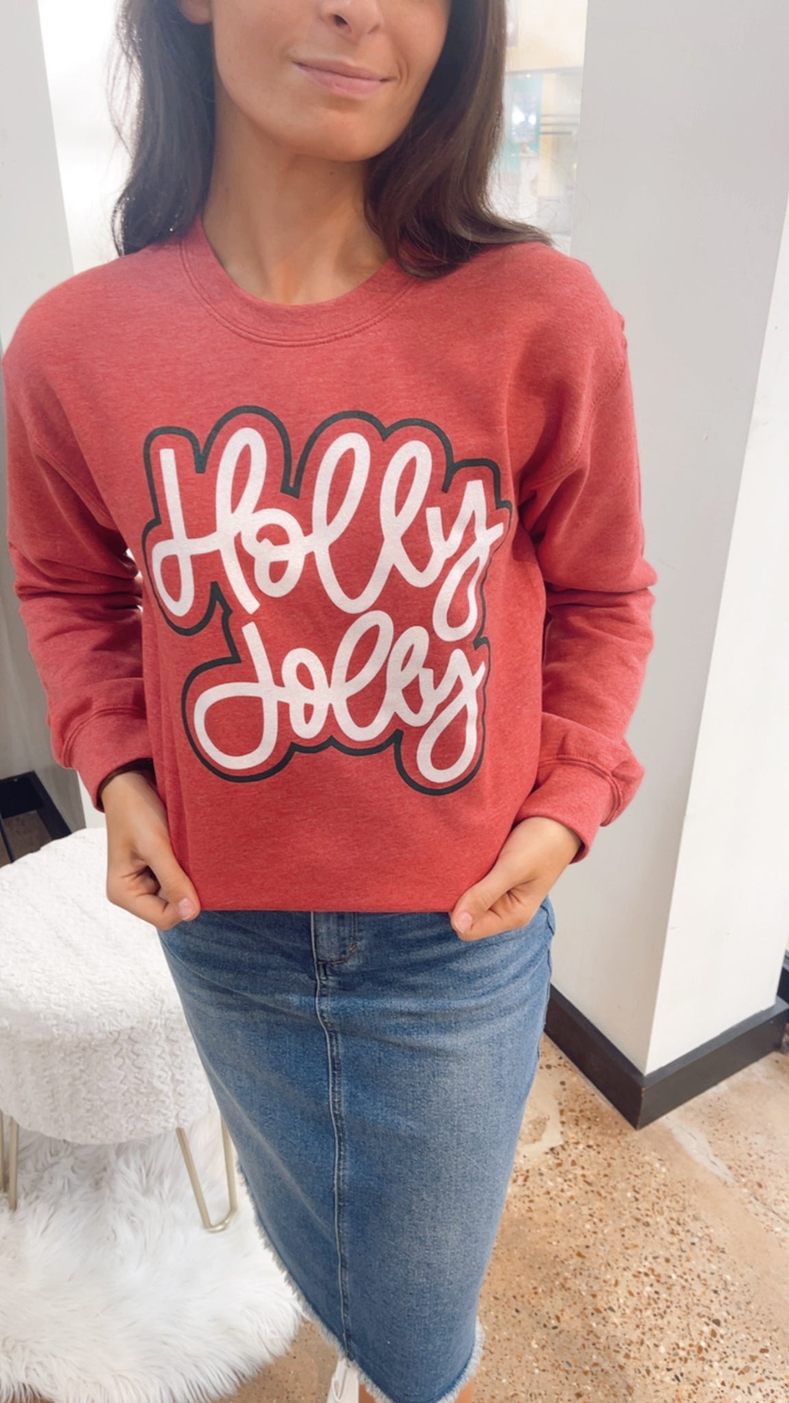 Embrace the festive spirit with this vintage red sweatshirt featuring "Holly Jolly" in eye-catching white sparkly lettering. Perfect for holiday gatherings, cozy nights in, or spreading seasonal cheer wherever you go. The classic red hue pairs beautifully with the shimmering text, creating a timeless piece that celebrates the magic of the season. Comfortable, stylish, and unmistakably merry—this sweatshirt is your go-to for making every moment feel festive.