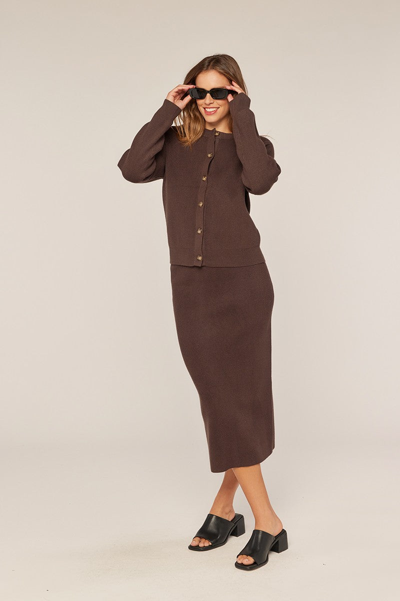 The "Midnight Mocha" skirt combines timeless elegance with everyday comfort. Crafted in a rich chocolate tone, this piece offers a flattering silhouette enhanced by a ribbed elastic waistband that provides gentle support and all-day wearability. Perfect for effortless styling, it transitions seamlessly from casual outings to more refined occasions. A versatile wardrobe essential that pairs beautifully with virtually any top.